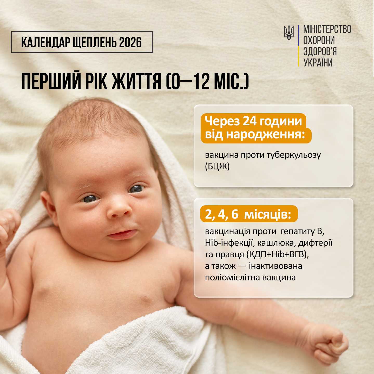 2, 4, та 6 місяців — перша, друга і третя дози щеплення комбінованою вакциною проти гепатиту В, Hib-інфекції, кашлюка, дифтерії та правця (КДП+Hib+ВГВ), а також — інактивованою поліомієлітною вакциною. Завдяки використанню комбінованої вакцини зменшується загальна кількість ін’єкцій для дитини та кількість уколів під час візитів до медзакладу.