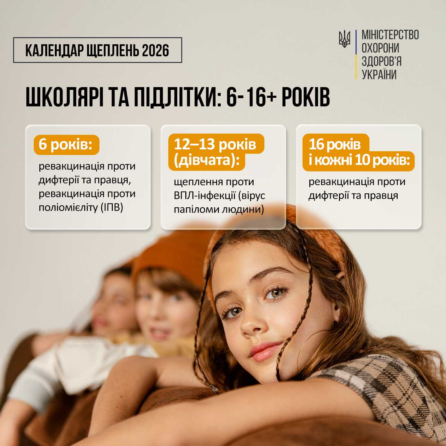 12-13 років — щеплення за однодозною схемою проти ВПЛ-інфекції (вірус папіломи людини) для дівчат віком від 12 до 13 років включно. Це нова у Календарі вакцина, яка має знизити ризики захворюваності та смертності першочергово від раку шийки матки, і від інших патологій, що зумовлені ВПЛ.